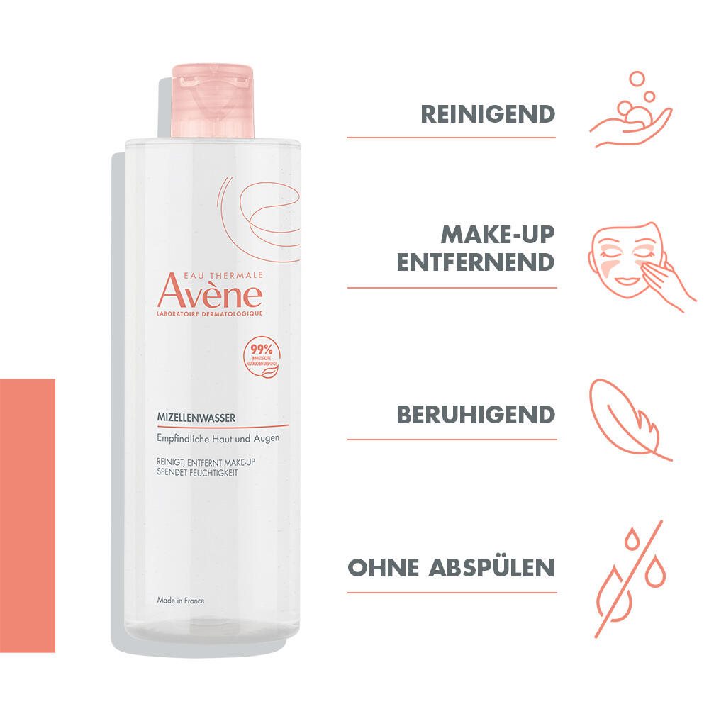 Dieses Mizellen-Reinigungswasser reinigt (sogar Verschmutzungspartikel*), spendet Feuchtigkeit** und beruhigt empfindliche Gesichts- und Augenpartien in einem einfachen Schritt. Sie enthält 99 % Aktivstoffe natürlichen Ursprungs und keine tierischen Bestandteile. Macht die Haut klar, weich, beruhigt und sorgt für Wohlbefinden. Täglich entfernt dieses zart duftende Erfrischungswasser Make-up und schenkt Geschmeidigkeit in einem einfachen und schnellen Schritt. Es verbessert die Feuchtigkeitszufuhr und bewahrt das natürliche Gleichgewicht der Haut dank der Kombination von Glycerin und Trehalose und der hohen Konzentration des Avène Thermalwassers mit seinen beruhigenden Eigenschaften. Seine Formulierung enthält ein Minimum an Aktivstoffen in genau der richtigen Dosierung, um Wirksamkeit und Verträglichkeit zu gewährleisten***. Die ökologisch gestaltete Flasche besteht aus recyceltem Kunststoff****und kann wiederverwertet werden. Die Mizellen-Reinigungslotion zum Entfernen von Make-up ist für Kontaktlinsenträger geeignet.
