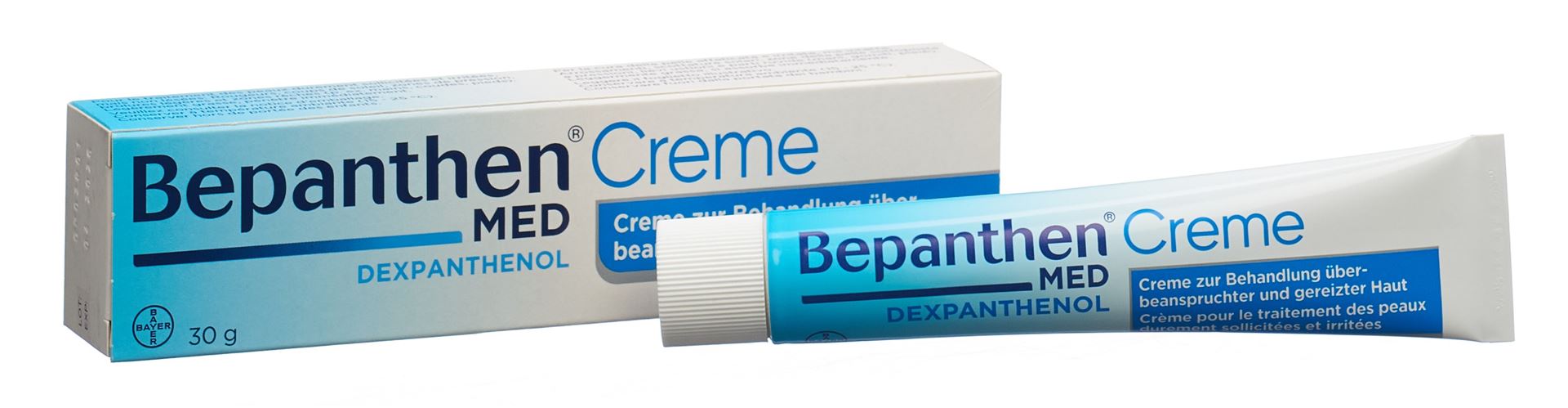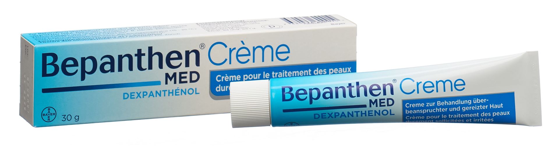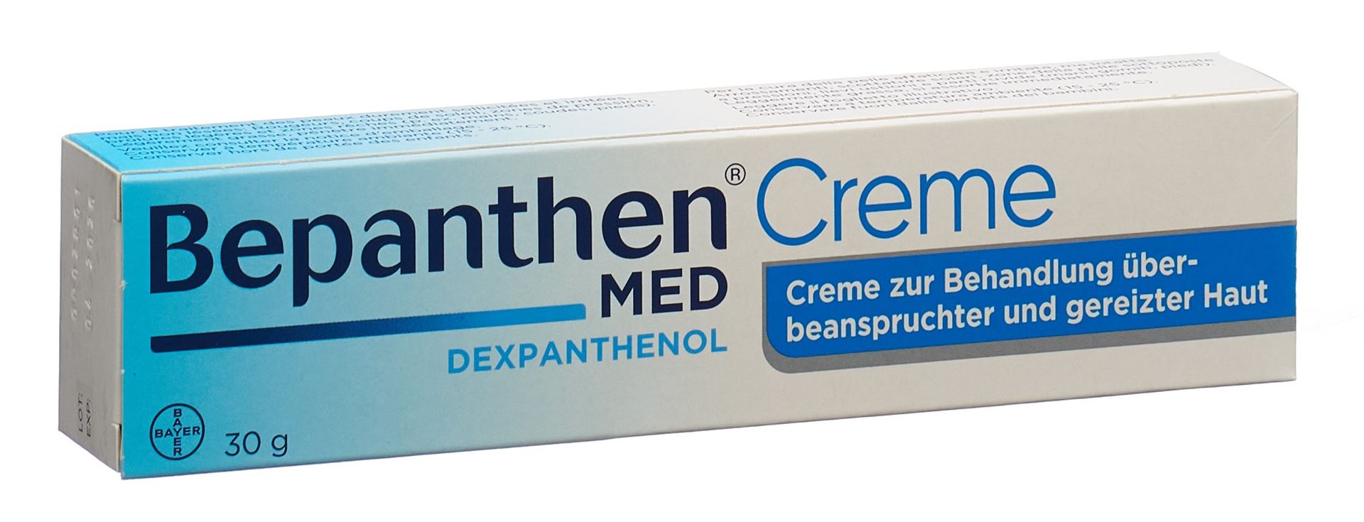 - Bepanthen MED Creme verwenden Sie zur Behandlung überbeanspruchter und gereizter, jedoch unverletzter Haut: bei Rötungen und Sonnenbrand; bei Druckstellen; bei leichten Verbrennungen; bei rauen Hautstellen (z.B. Hände, Ellenbogen, Füsse).