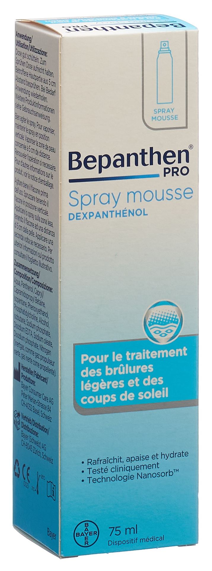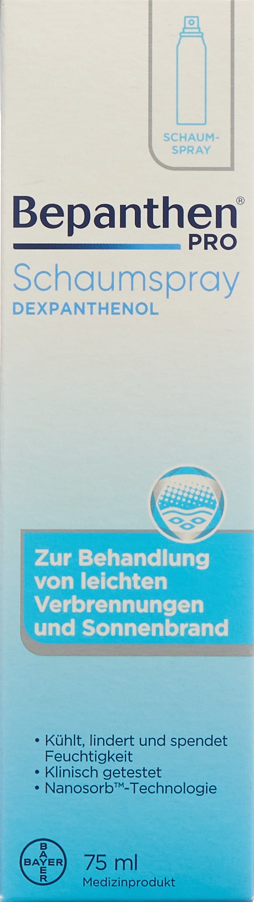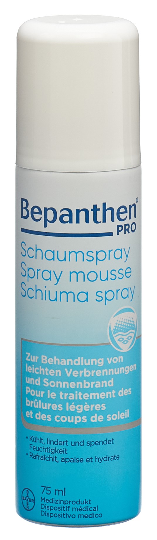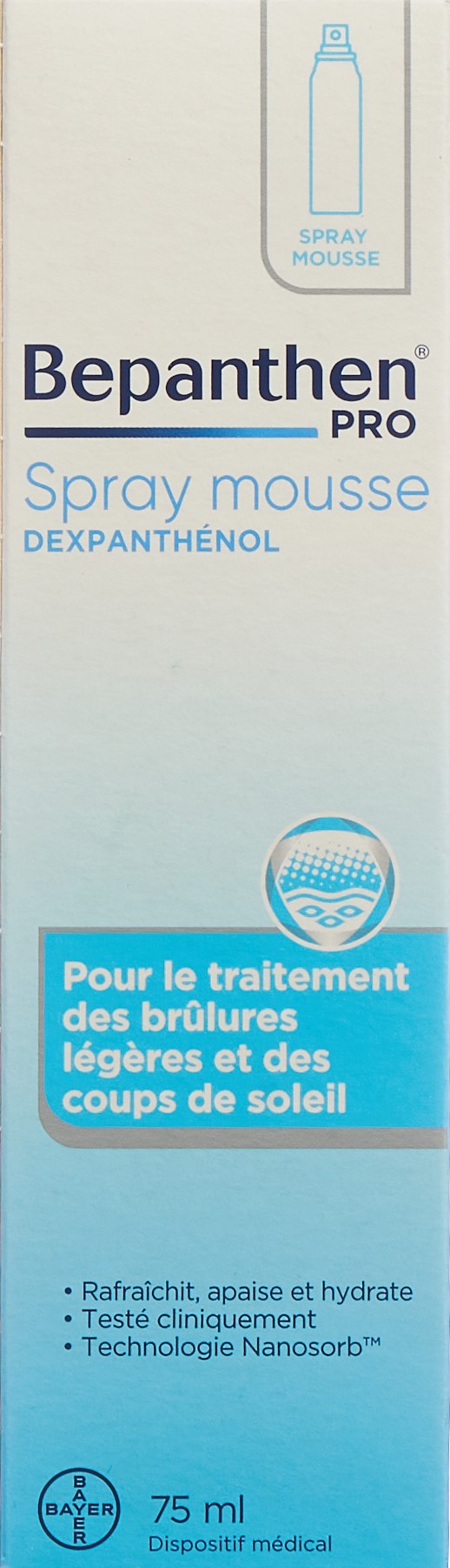 Bepanthen Schaumspray ist ein weisser, weicher Schaum in Form einer modernen Nanoemulsion zum Auftragen auf leichte Verbrennungen und leichten Sonnenbrand. Der Schaum muss nicht in die Haut einmassiert werden, sondern zieht von alleine ein und gestattet daher eine schmerzlose Anwendung.