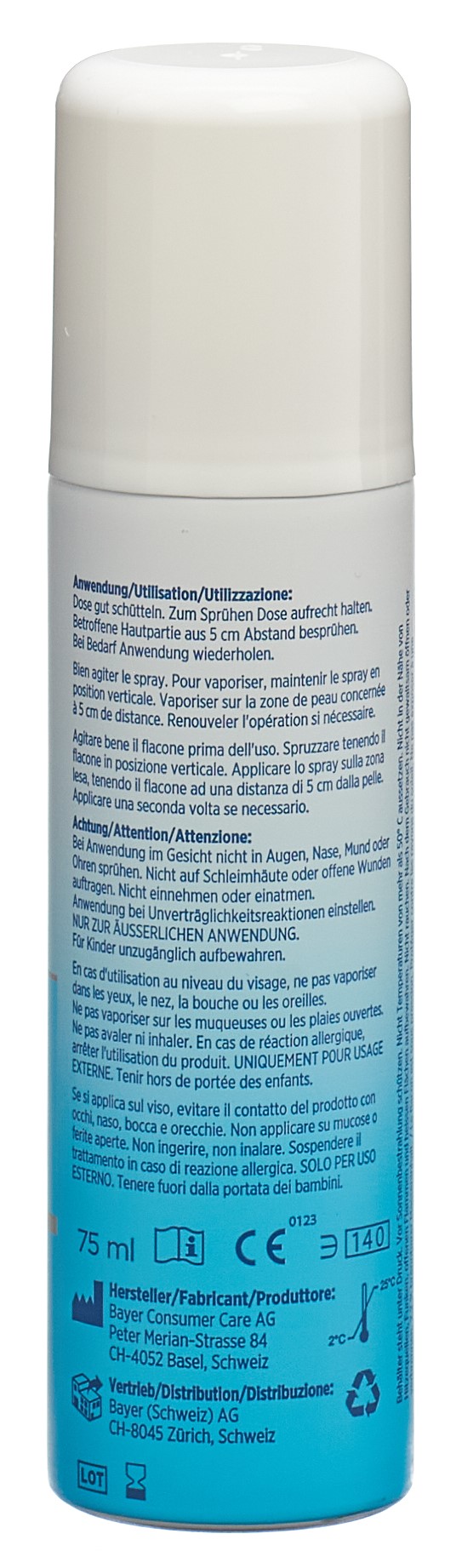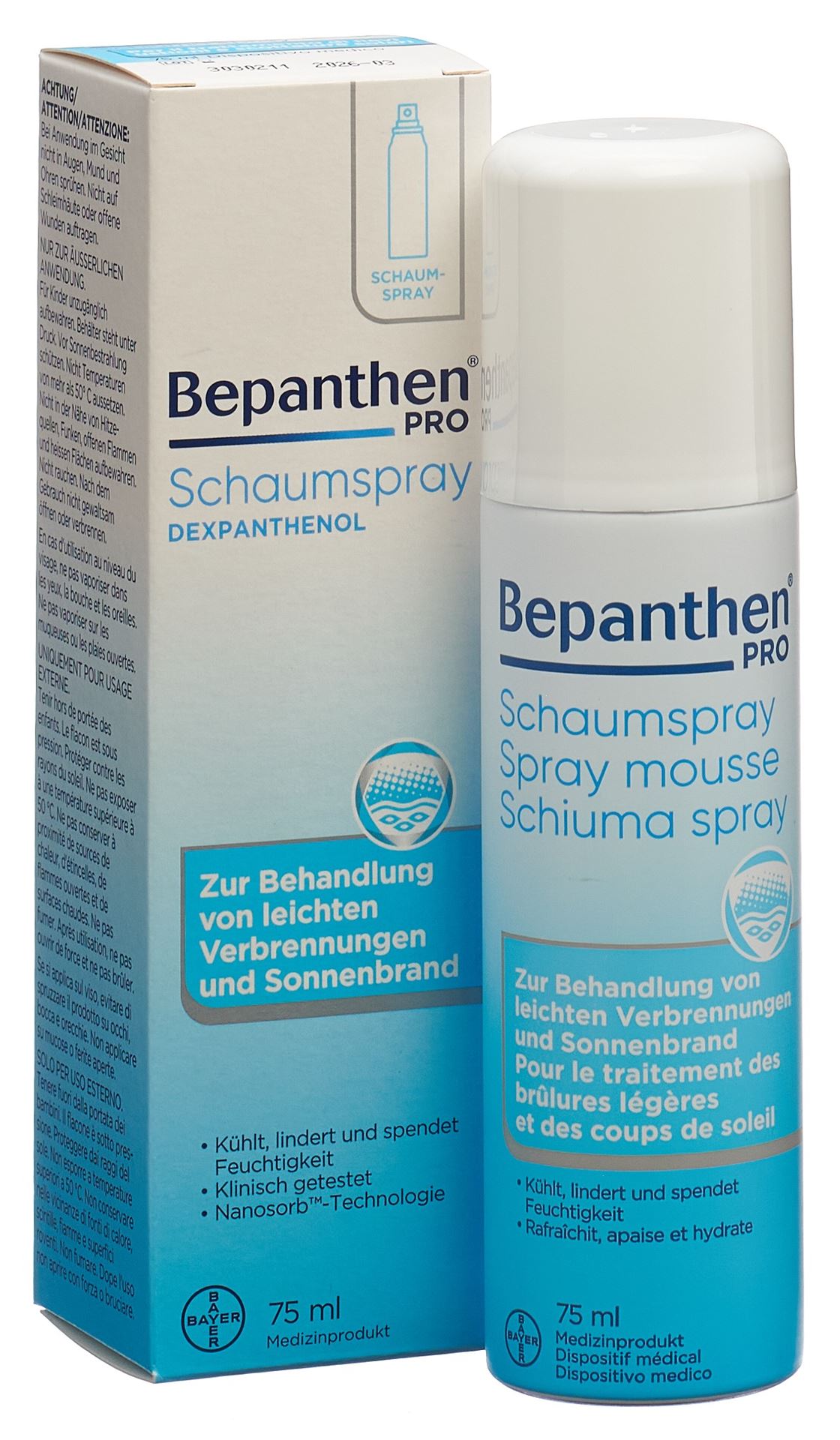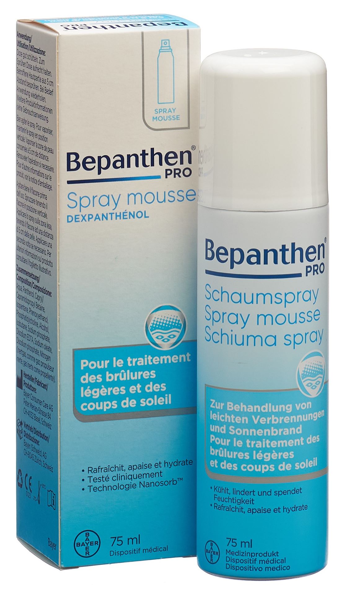 Bepanthen Schaumspray ist ein weisser, weicher Schaum in Form einer modernen Nanoemulsion zum Auftragen auf leichte Verbrennungen und leichten Sonnenbrand. Der Schaum muss nicht in die Haut einmassiert werden, sondern zieht von alleine ein und gestattet daher eine schmerzlose Anwendung.