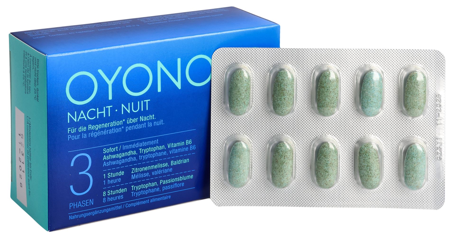 OYONO NACHT ist ein Nahrungsergänzungsmittel mit einer innovativen 3-Phasen Tablette. Die Tablette ist besonders durch die 3-Phasen-Technologie, welche die Inhaltsstoffe zeitlich versetzt freigibt. Die Tablette besteht aus Pflanzenextrakten von Ashwagandha, Baldrian, Passionsblume, Zitronenmelisse, dem Vitamin B6 sowie der Aminosäure L-Tryptophan. Vitamin B6 trägt zu einer normalen Hormontätigkeit, einem normalen Energiestoffwechsel und normalen Funktionen des Nervensystems bei.