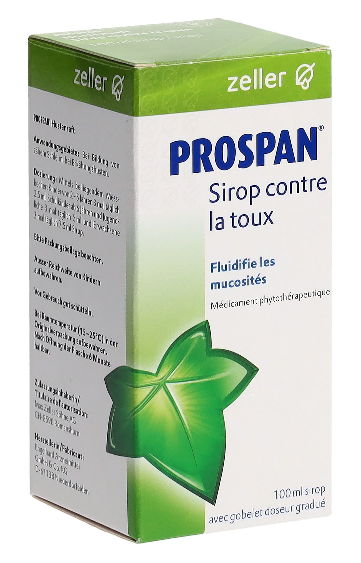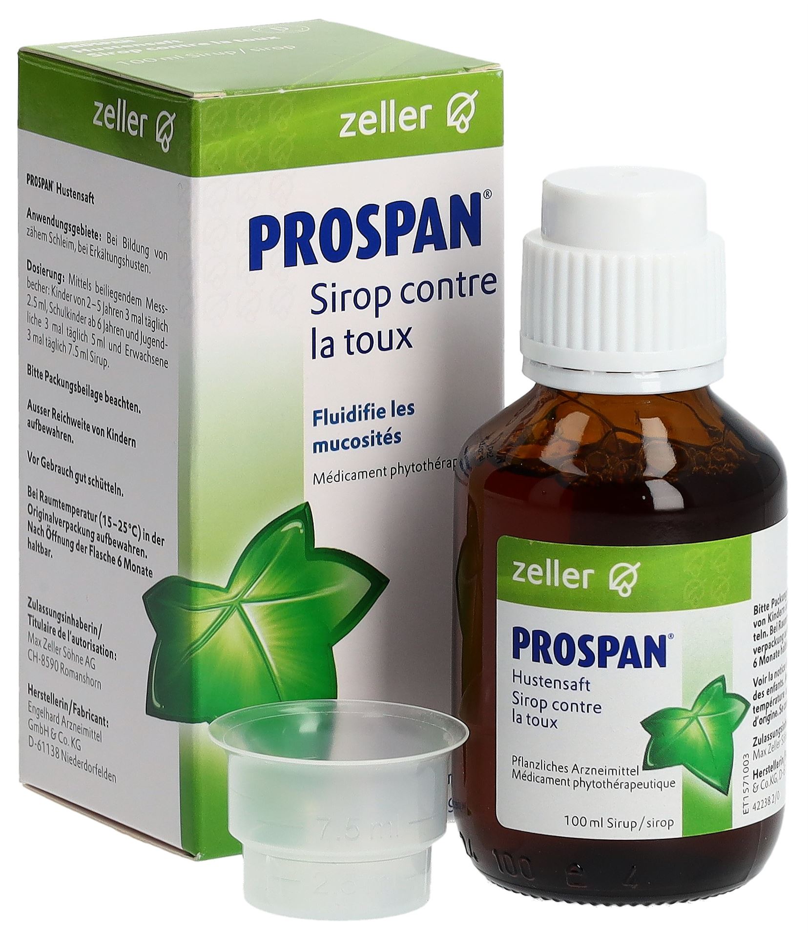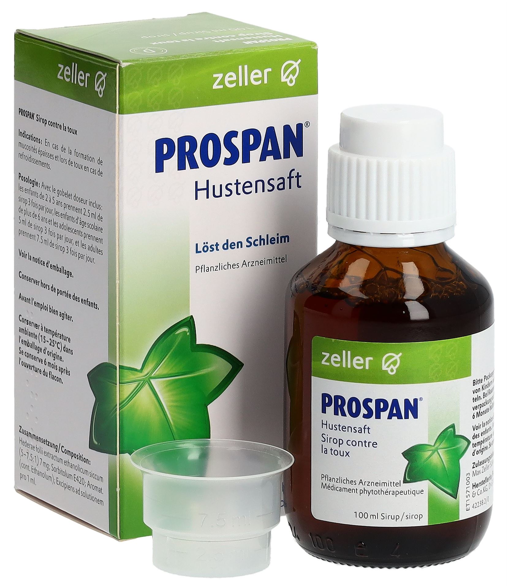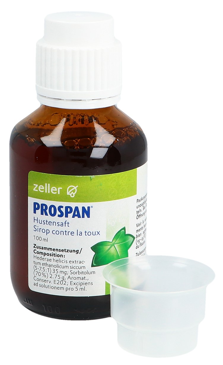 Produktinformationen Anwendungsgebiet PROSPAN® Hustensaft wird angewendet bei: Übermässiger Bildung von zähem Schleim, Erkältungshusten – Ab 2 Jahren – Schleimlösend – Erweitert die Bronchien Dosierung / Anwendung / Packung Erwachsene: 3 Mal täglich 7.5 ml Saft einnehmen Kinder ab 6 Jahren und Jugendliche: 3 Mal täglich 5 ml Saft einnehmen Kleinkinder ab 2 Jahren: 3 Mal täglich 2.5 ml Saft einnehmen Packungsgrössen: 100 ml 200 ml Wirkstoffe 5 ml enthalten als Wirkstoff: 35 mg Trockenextrakt EA575® aus Efeublättern (Hederae helicis folium)