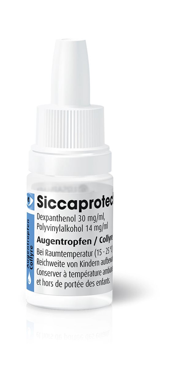 Siccaprotect wird bei leichten Reizungen des Auges sowie zur Befeuchtung der Augen angewendet. Der Wirkstoff Dexpanthenol wirkt lindernd und zellaufbauend auf Augenhornhaut und Bindehaut, so dass leichte Reizungen vermindert bzw. verhindert werden können.