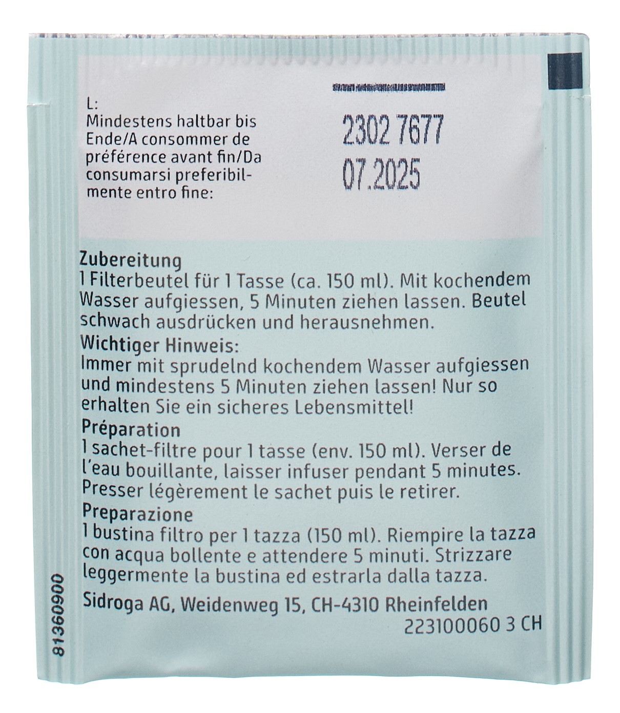 Zubereitung: 1 Teebeutel für 1 Tasse (150 ml). Mit siedendem Wasser aufgiessen, 5 Minuten ziehen lassen. Beutel schwach ausdrücken und herausnehmen. Wichtiger Hinweis: Immer mit sprudelnd kochendem Wasser aufgiessen und mindestens 5 Minuten ziehen lassen! Nur so erhalten Sie ein sicheres Lebensmittel!