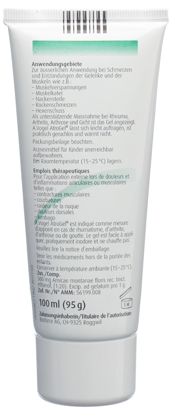 A.Vogel AtroGel ist ein Frischpflanzen-Präparat aus Arnika montana-Blüten zur äusserlichen Anwendung bei Schmerzen und Entzündungen der Gelenke und der Muskeln wie z.B. Muskelverspannungen, Muskelkater, Nackensteife, Rückenschmerzen und Hexenschuss. Als unterstützende Massnahme bei Rheuma, Arthritis, Arthrose und Gicht ist das Gel angezeigt. Das Gel lässt sich leicht auftragen, ist praktisch geruchlos und wärmt nicht.