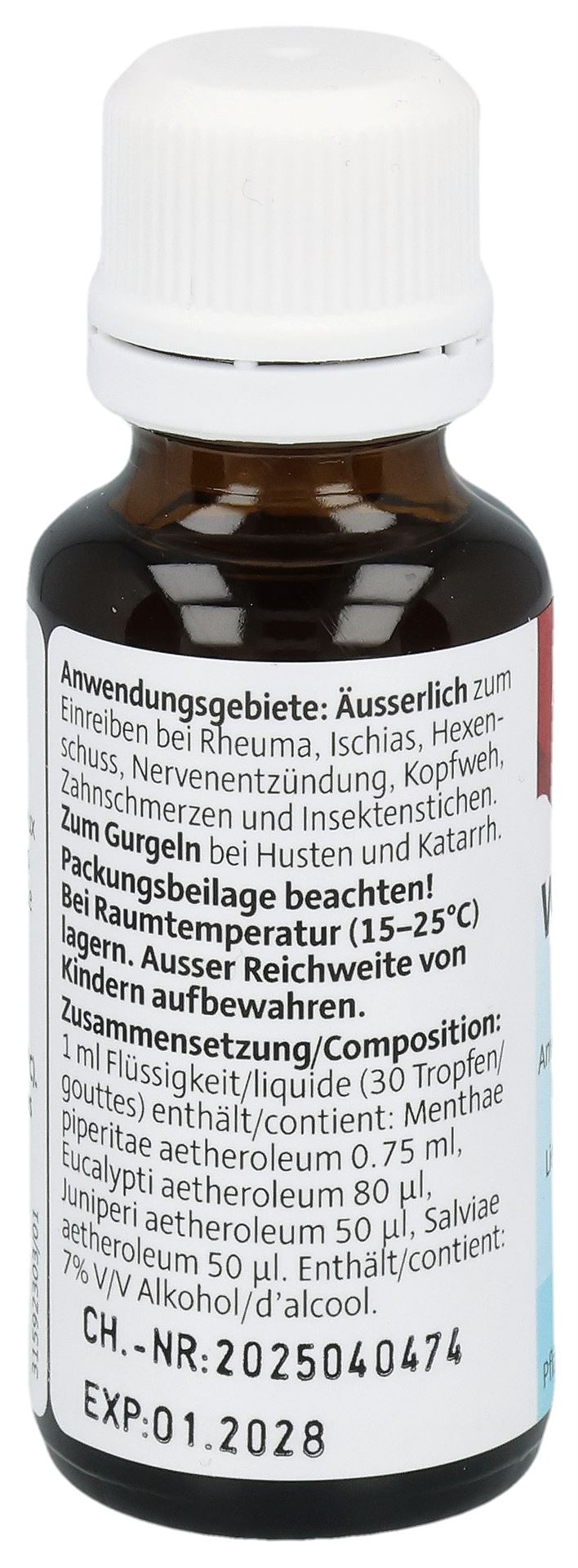 1 ml (ca. 30 Tropfen) WIEWOHL enthält: Pfefferminzöl 0,75 ml, Eucalyptusöl 80 ul, Wacholderöl 50 ul, Salbeiöl 50 ul. Enthält 7 Vol.-% Alkohol.