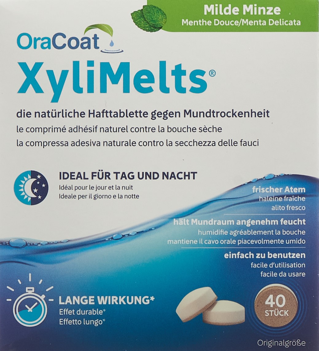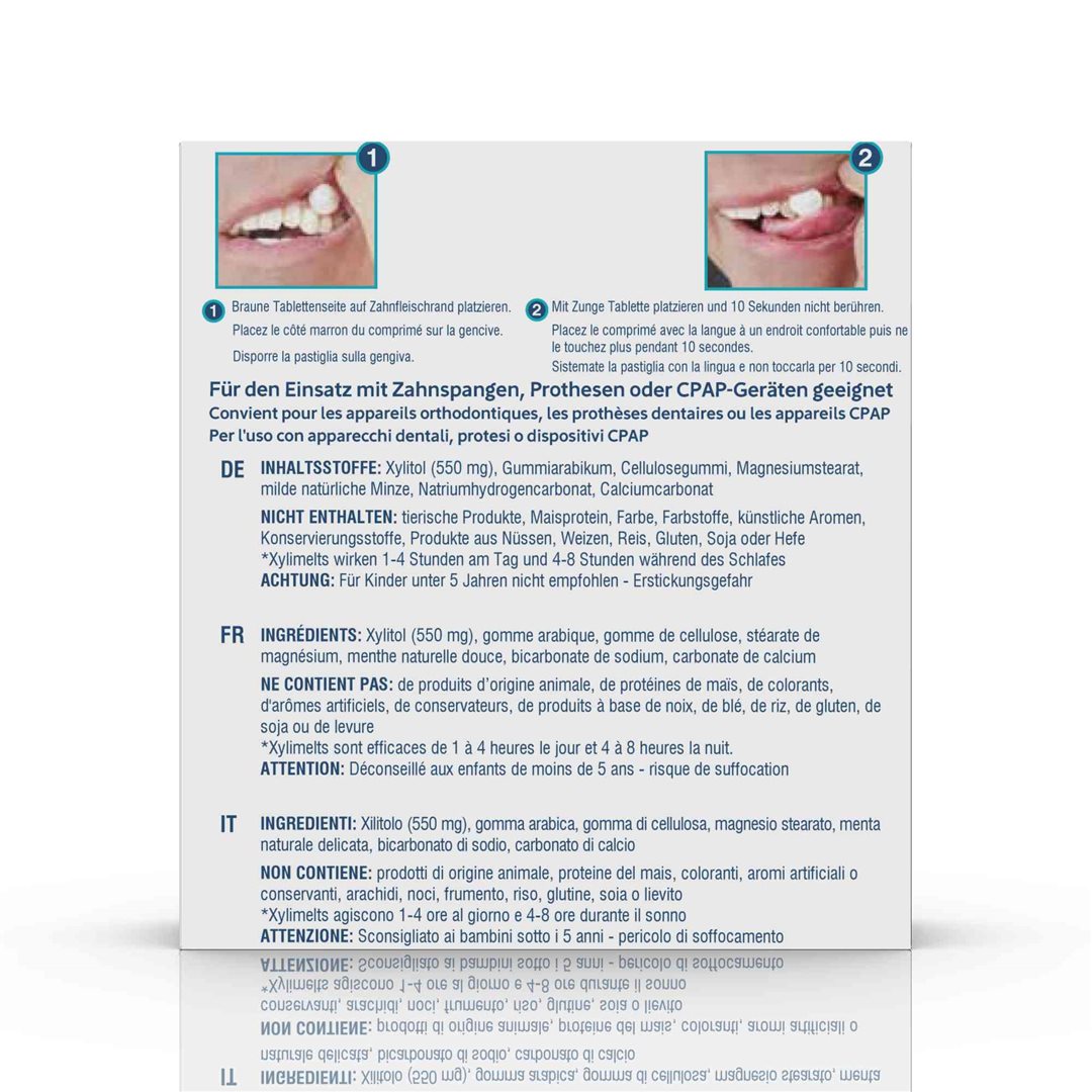 Braune Tablettenseite auf Zahnfleischrand platzieren. Mit Zunge Tablette platzieren und 10 Sekunden nicht berühren. Xylimelts wirken 1-4 Stunden am Tag und 4-8 Stunden während des Schlafes.